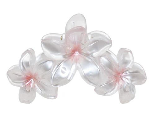 Inspired by the plumeria flower, this Super Bloom hair claw clip represents love and new beginnings. Effortless yet playful, this claw clip with 3 plumerias is large enough to hold a full head of hair, and perfect for a half-up-half-down.