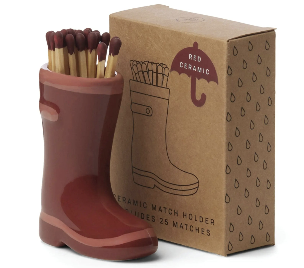 Includes: 25 colorful safety matches with ceramic wellington boot match holder