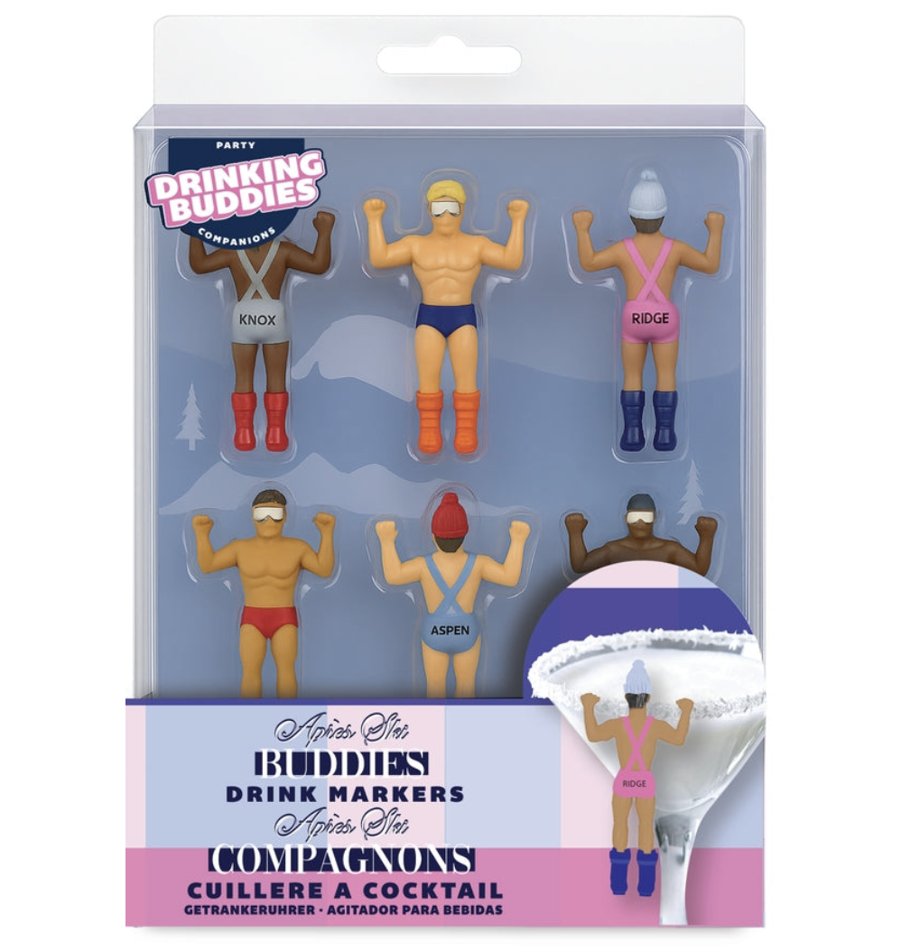 Our Après Ski Buddies fit on the edge of your drink so you can sip in style. These tiny guys are sure to bring Big Après Vibes. They love a good party and a great cocktail — no lift ticket required. 6 come in a pack.