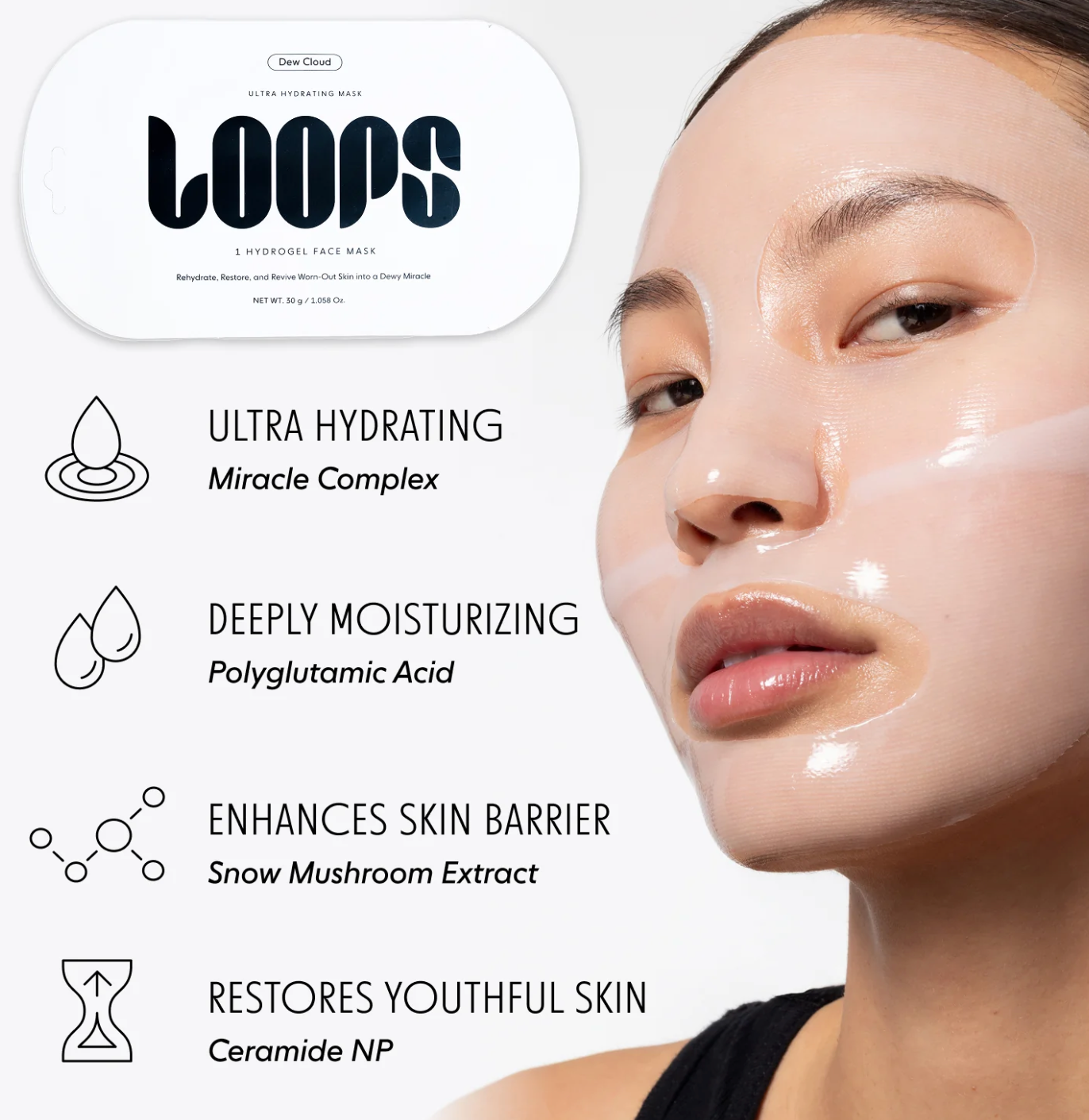 Your face is the first to suffer from a hectic lifestyle. Dew Cloud acts like an instant oasis to quickly revive dry, dull complexions no matter your age or skin type. This miraculously moisturizing face mask is formulated with the Miracle Complex - a deeply penetrating blend of skin vitamins, humectants, and antioxidants that offers complete anti-aging support and plumping hydration. Retinol and Niacinamide help stimulate collagen production to fight signs of premature skin again, while two molecular weights of hyaluronic acid help trap moisture in every layer of your skin's surface. The quenching powers of Snow Mushroom and Polyglutamic Acid combine to flood your skin with water-light hydration, while skin-identical Ceramide NP fortifies your lipid barrier to prevent moisture loss, helping it look firmer, smoother, and more refreshed in just 10 minutes.
