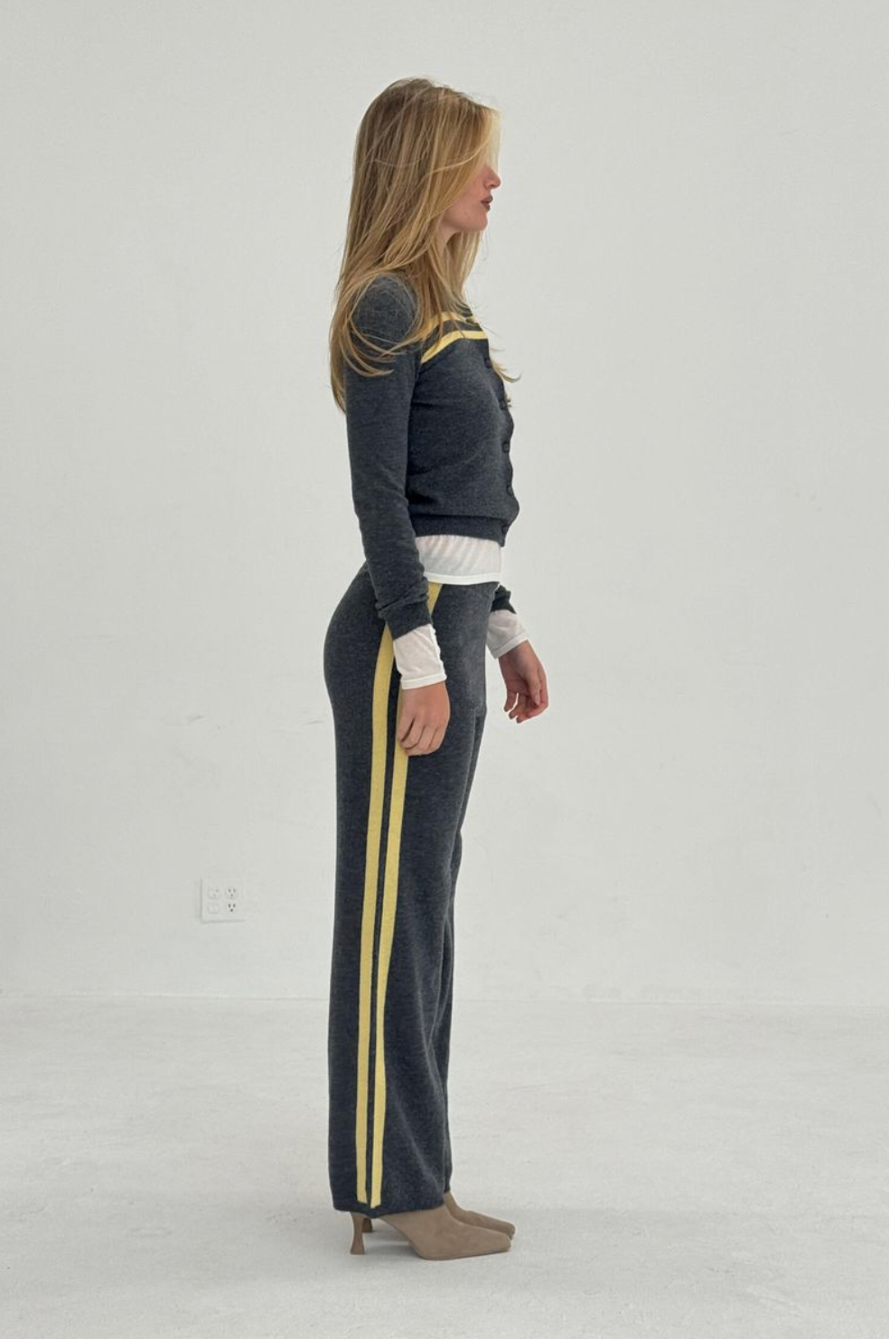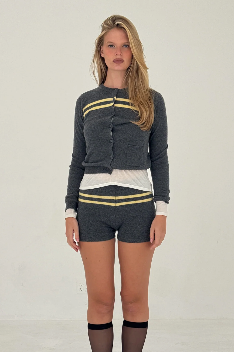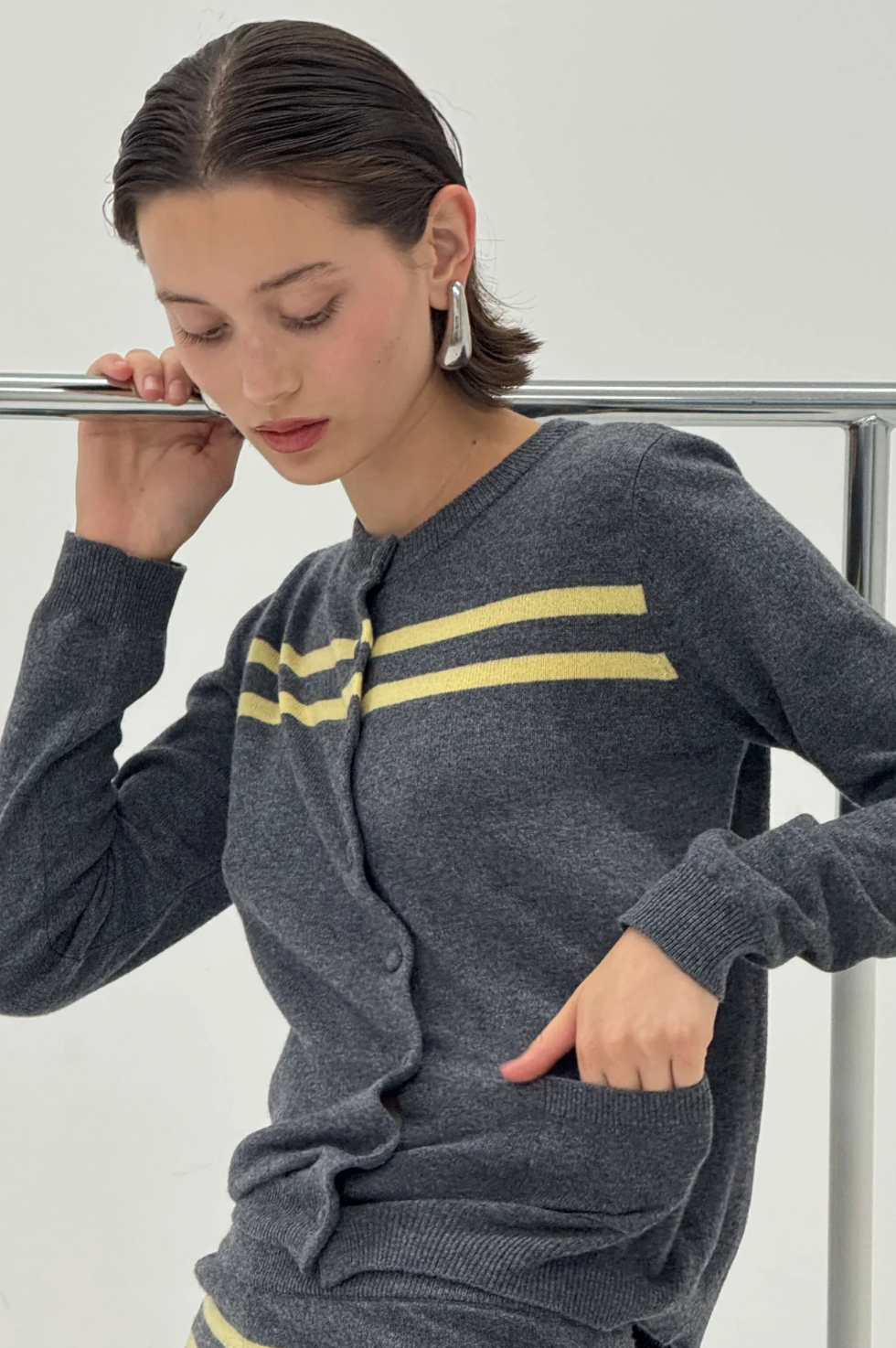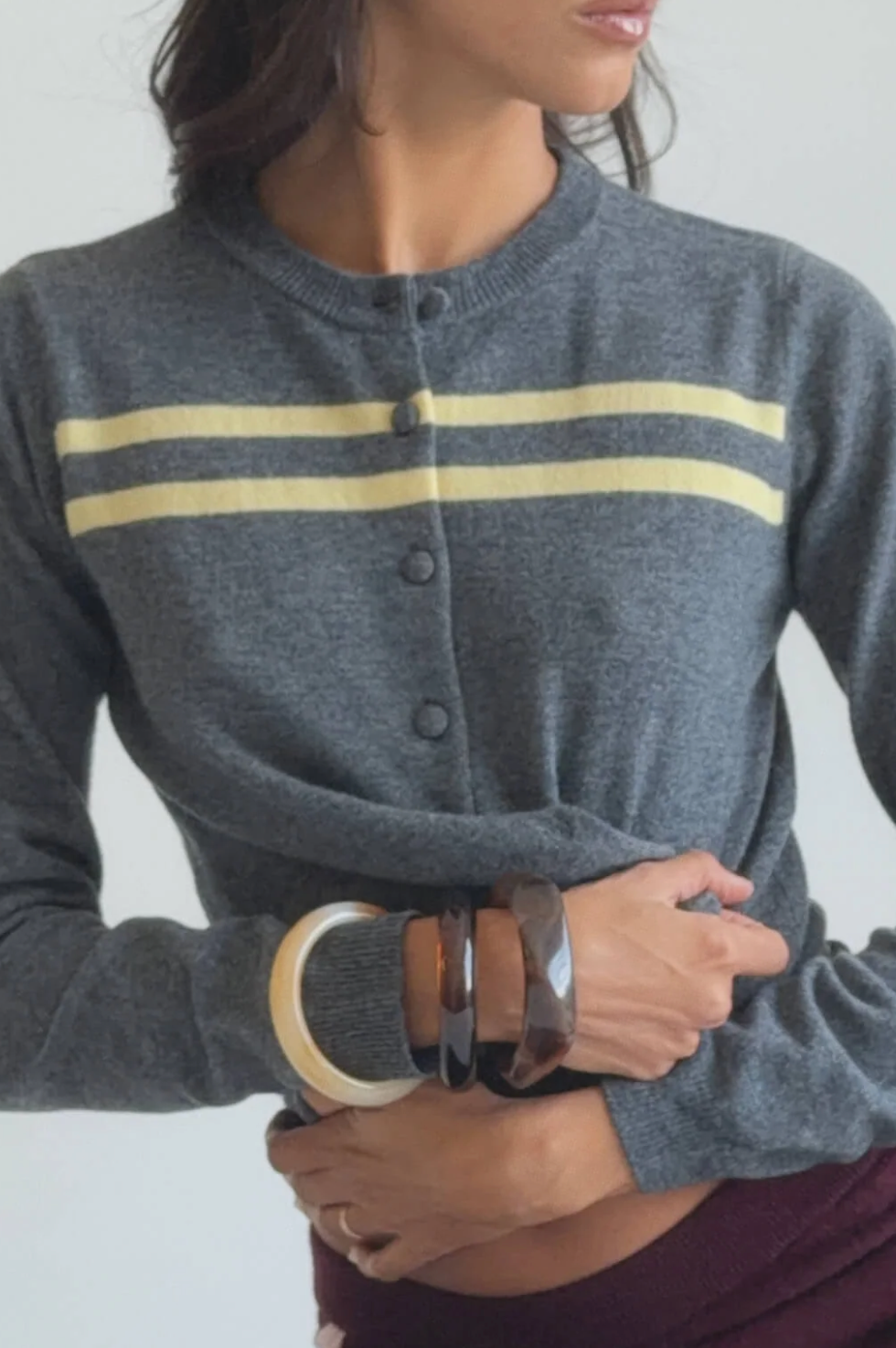 Cashmere Wool Stripe Cardigan In Charcoal/Butter