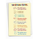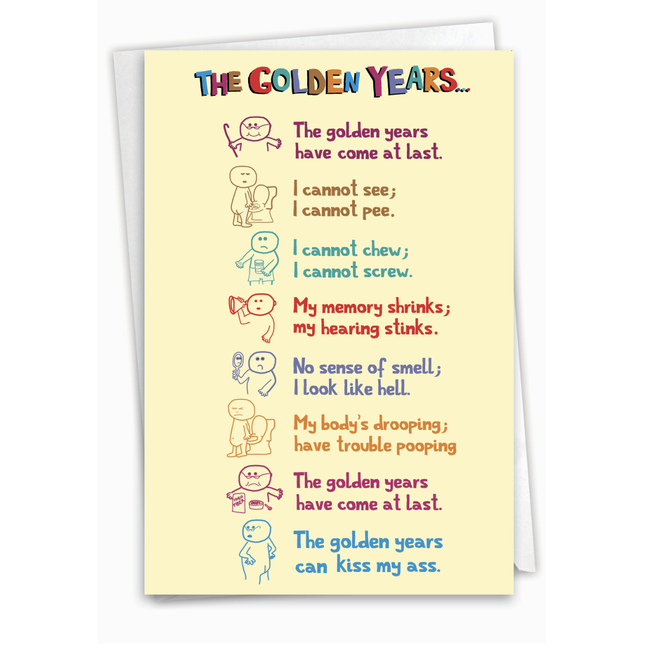 Cover Reads: The Golden Years...The Golden Years Have Come At Last. I Cannot See; I Cannot Pee. I Cannot Chew; I Cannot Screw. My Memory Shrinks; My Hearing Stinks. No Sense Of Smell; I Look Like Hell. My Body's Drooping; Now Trouble Pooping. The Golden Years Have Come At Last. The Golden Years Can Kiss My Ass.